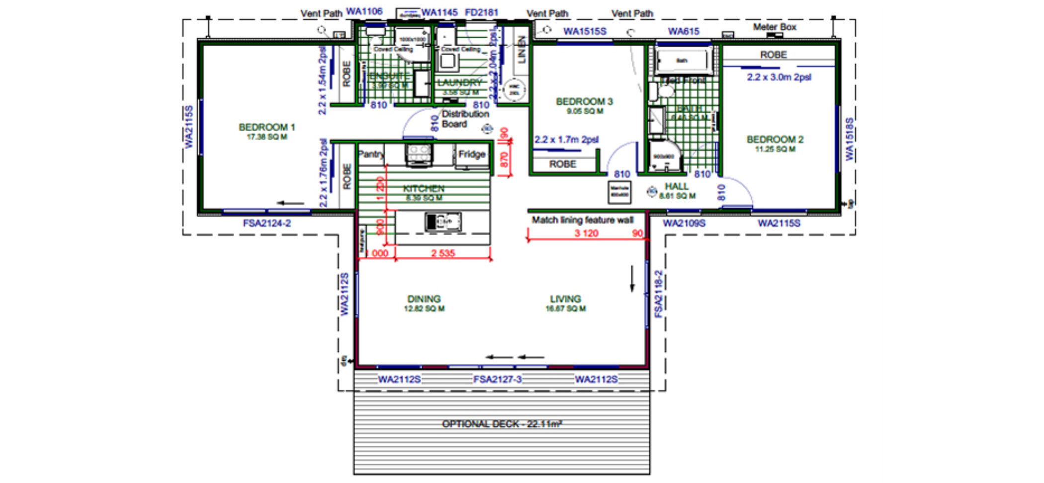 This compact home is designed to maximise space and is ideal for guests. Two bedrooms and a bathroom complete with bath and separate shower are at one end, and the master suite with its own ensuite and double robes is situated at the other end.